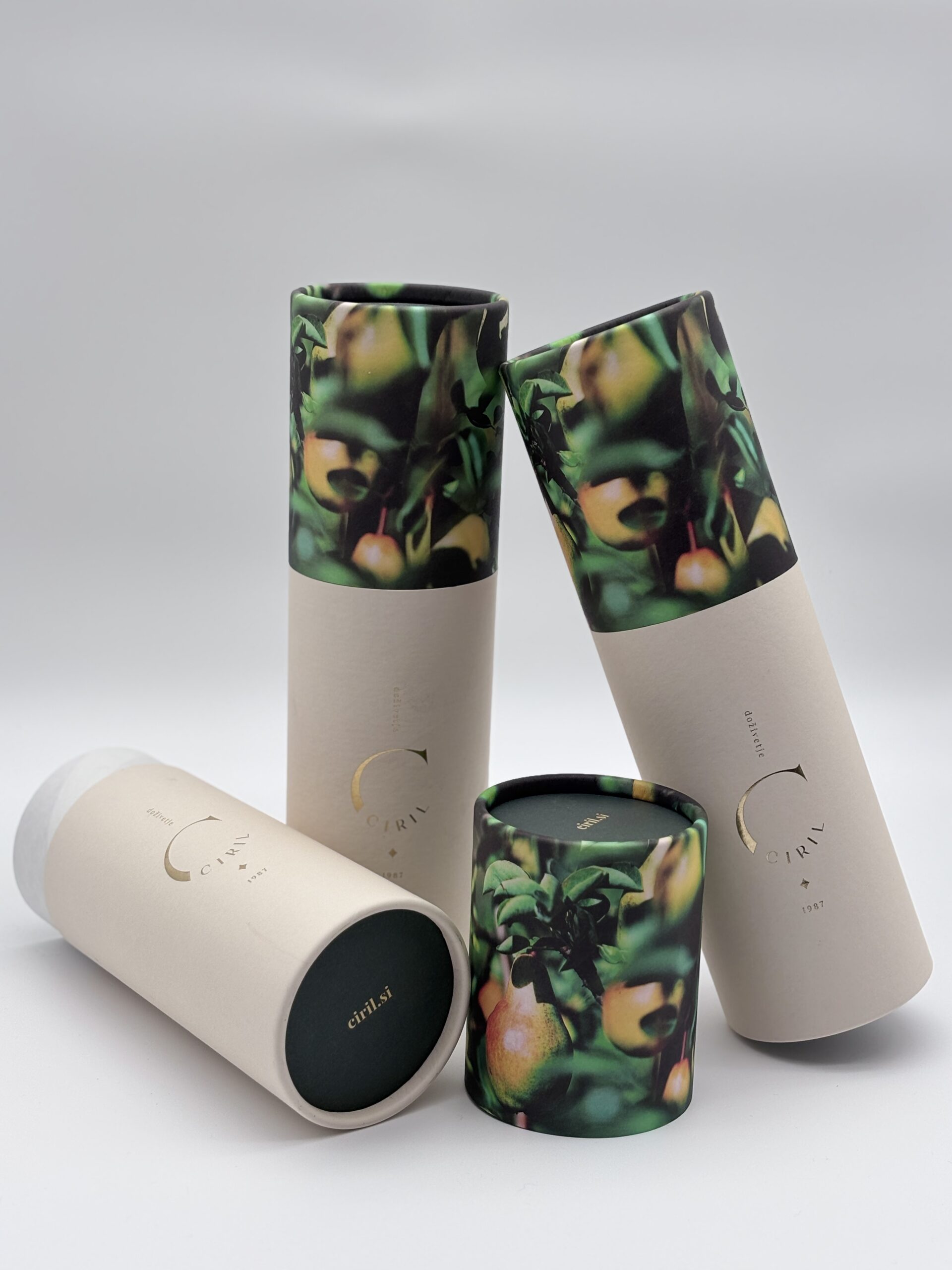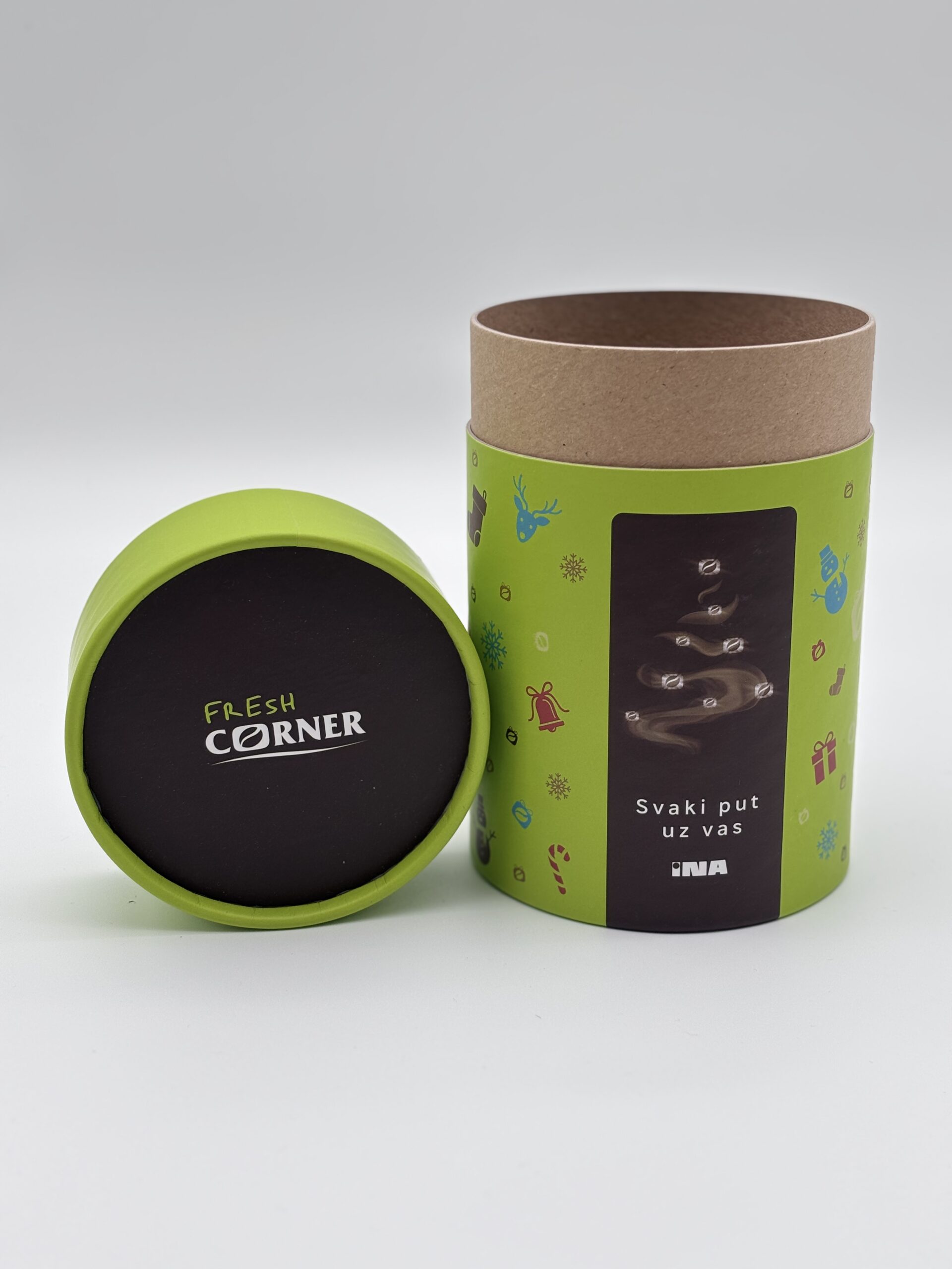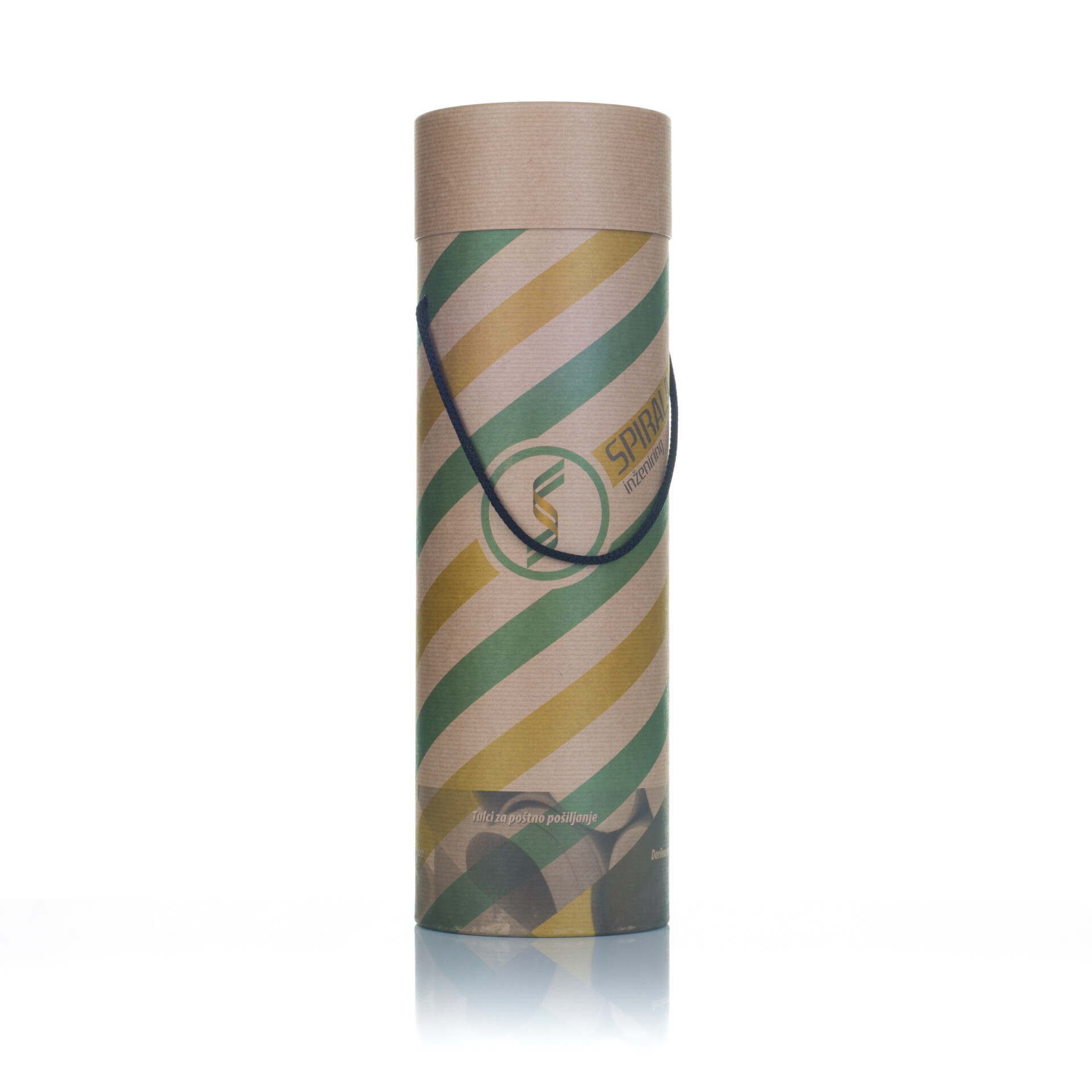 Embalaža je izdelana iz zunanjega plašča in notranjega povezovalnega vratu. Zunanji plašč je razdeljen na spodnji del (dno) in zgornji (pokrov). Spodnji del plašča je zalepljen z povezovalnim vratom. Pokrov – zgornji del zunanjega plašča je snemljiv. Zapiranje je lahko izvedeno z pločevino, kartonskim robljenjem ali pa PE pokrovi. Kartonski diski so lahko zunaj pokaširani z etiketo enake kvalitete kot ovojna etiketa. Zunanja površina šatulje je lahko spiralno navita ali paralelno kaširana z ovojno etiketo. Izdelujemo jih v naslednjih notranjih premerih : fi 55/58, 60/62, 64/67, 67/70, 77/80, 99/102, 102/105,120/123, 151/154 mm – zapiranje karton.